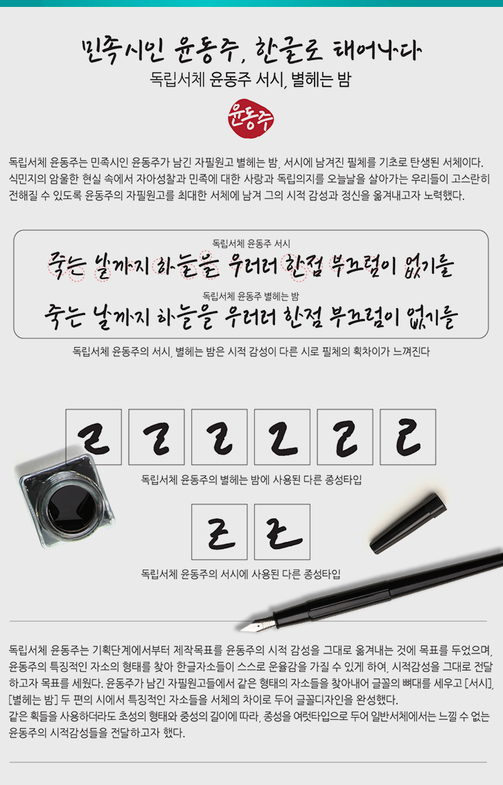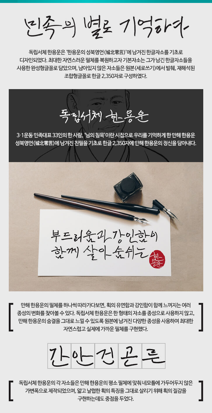독립서체 1차 캠페인을 통해 삼일절 100주년을 기념하여, 독립운동가 한용운 서체와 윤봉길 서체를 개발/무료 배포하였고, 독립서체 2차 캠페인에서는 백범 김구 서체와 윤동주 서체(별 헤는 밤 & 서시 두 가지 버전)를 개발하여 무료 배포 중에 있습니다.