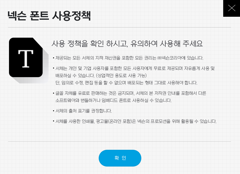 - 단, 글꼴 자체를 유료로 판매하는 것을 금지하며 해당 글꼴에 대한 변형 및 재배포를 할 수 없습니다.