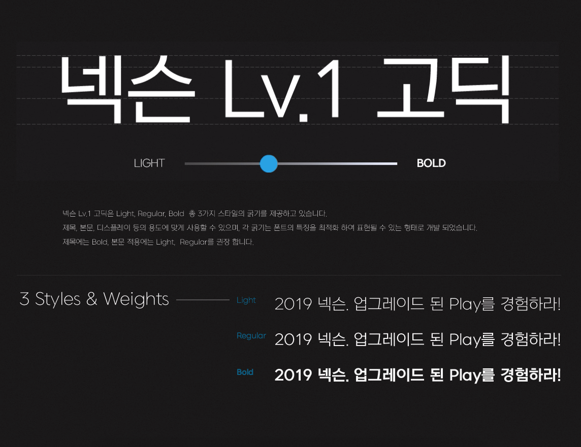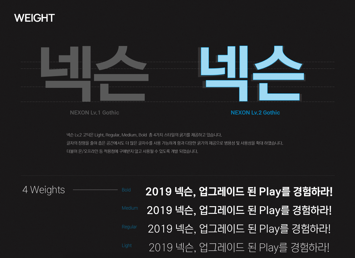 LEVEL UP의 첫 단계로 게임에서 경험했던 느낌을 서체에 담아 표현했습니다. 서체의 기능적인 부분 외에도 즐거운 경험들을 전달하고자 하는 또 다른 도전의 시작입니다.