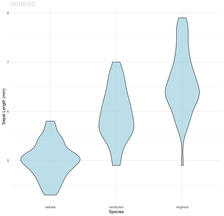 labs(title = "바이올린 플롯", x = "Species", y = "Sepal Length (mm)") +
