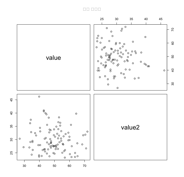 pairs(data[, c("value", "value2")], main = "다중 산점도")
