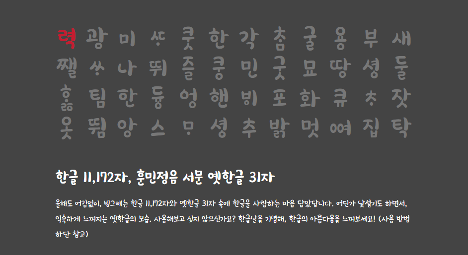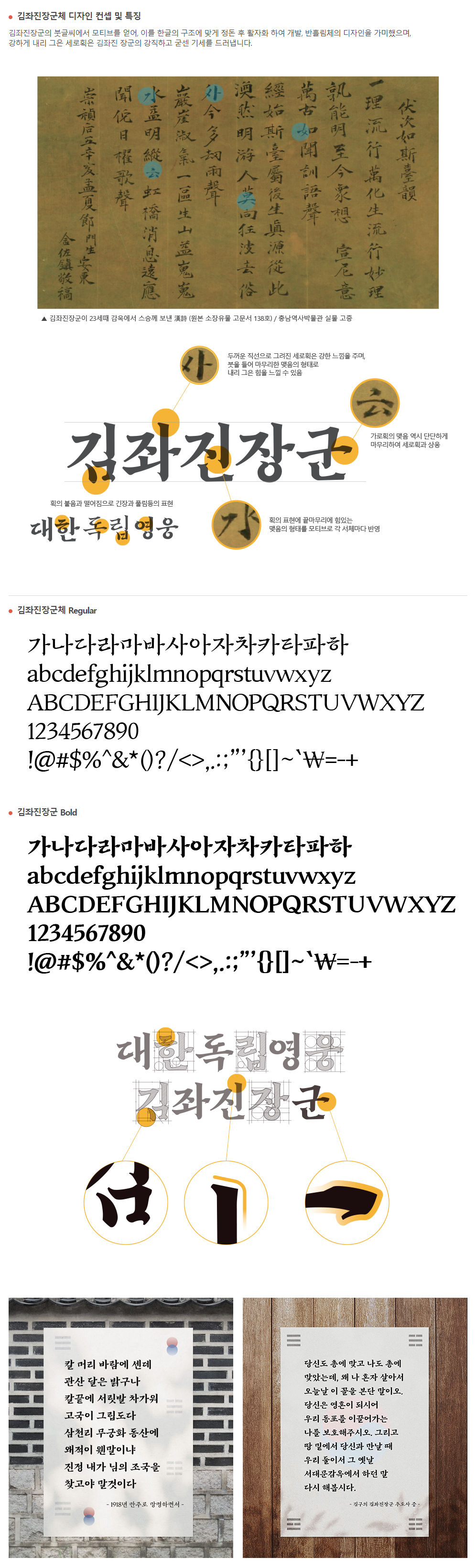 독립서체 1차 캠페인을 통해 삼일절 100주년을 기념하여, 독립운동가 한용운 서체와 윤봉길 서체를 개발/무료 배포하였고, 독립서체 2차 캠페인에서는 백범 김구 서체와 윤동주 서체(별 헤는 밤 & 서시 두 가지 버전)를 개발하여 무료 배포 중에 있습니다.