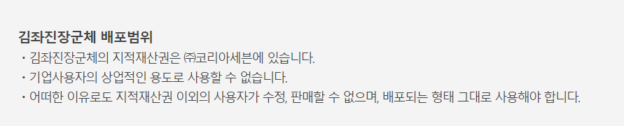 단, 글꼴 자체를 유료로 판매하는 것은 금지하며, 배달의민족 한나체, 한나체 Air, 한나체 Pro, 주아체, 도현체, 연성체, 기랑해랑체, 을지로체는 본 저작권 안내와 라이선스 전문을 포함해서 다른 소프트웨어와 번들하거나 재배포 또는 판매가 가능합니다. 배달의민족 한나체, 한나체 Air, 한나체 Pro, 주아체, 도현체, 연성체, 기랑해랑, 을지로체체 라이선스 전문을 포함하기 어려울 경우, 배달의민족 한나체, 한나체 Air, 한나체 Pro, 주아체, 도현체, 연성체, 기랑해랑체, 을지로체의 출처 표기를 권장합니다. 예) 이 페이지에는 우아한형제들에서 제공한 배달의민족 한나체, 한나체 Air, 한나체 Pro, 주아체, 도현체, 연성체, 기랑해랑체, 을지로체가 적용되어 있습니다.